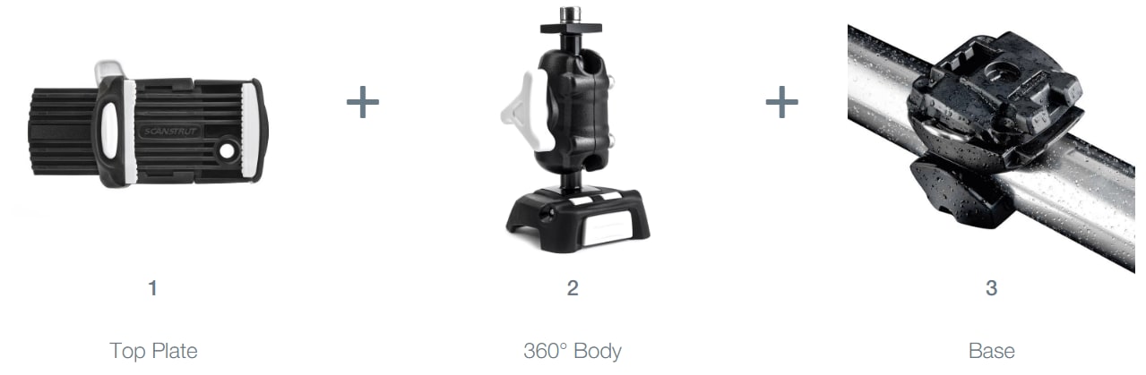 Systemet består av en topplate/mobilholder, en 360 graders dreibar brakett og en base for rekkemontering: